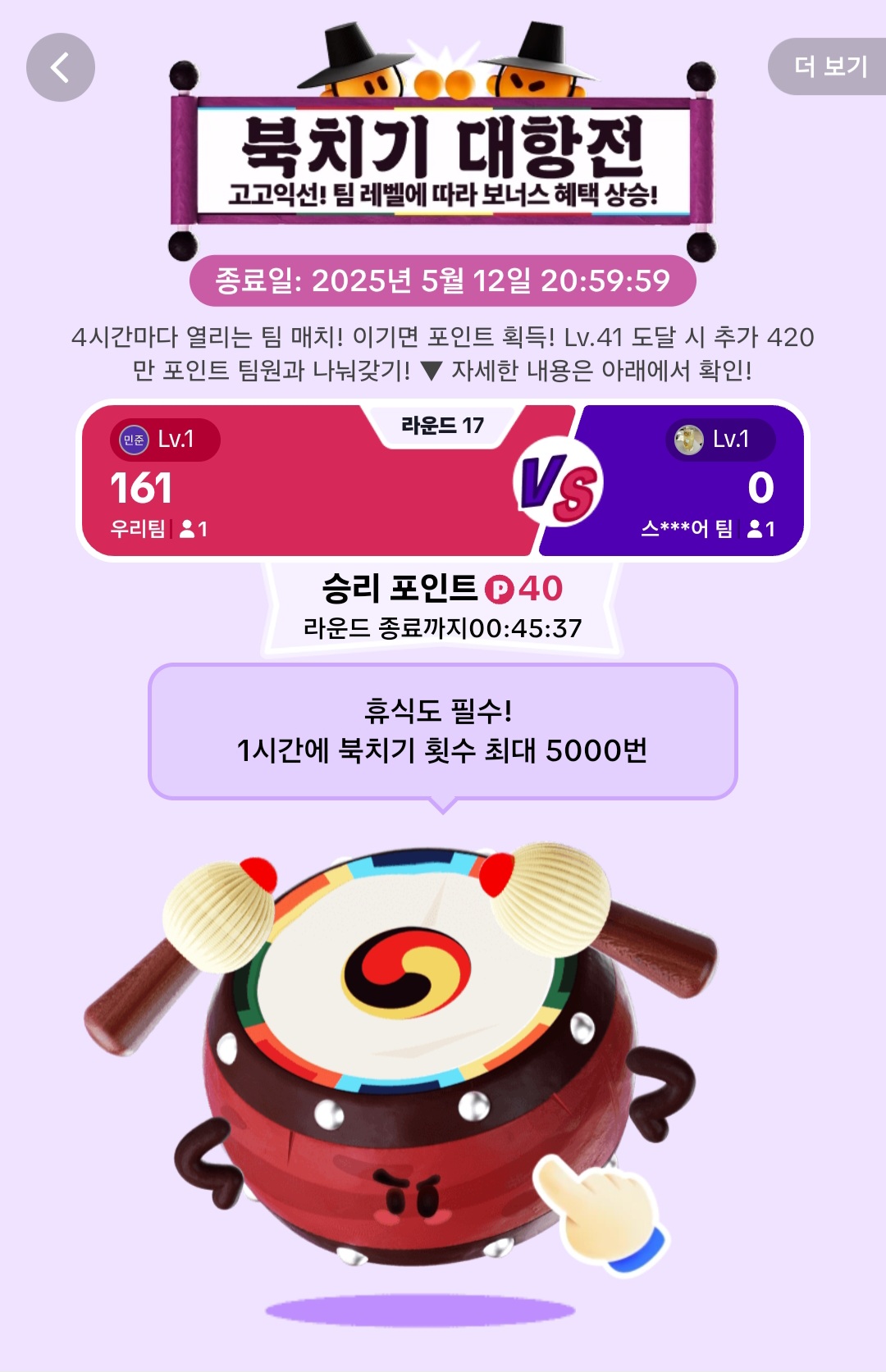 지금 바로 북치기 대항전에 참여하고 포인트 받아가세요!