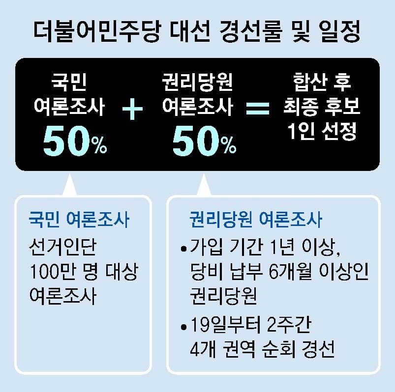 - 권리당원 투표(50%) + 일반 국민 여론조사(50%) 합산 방식