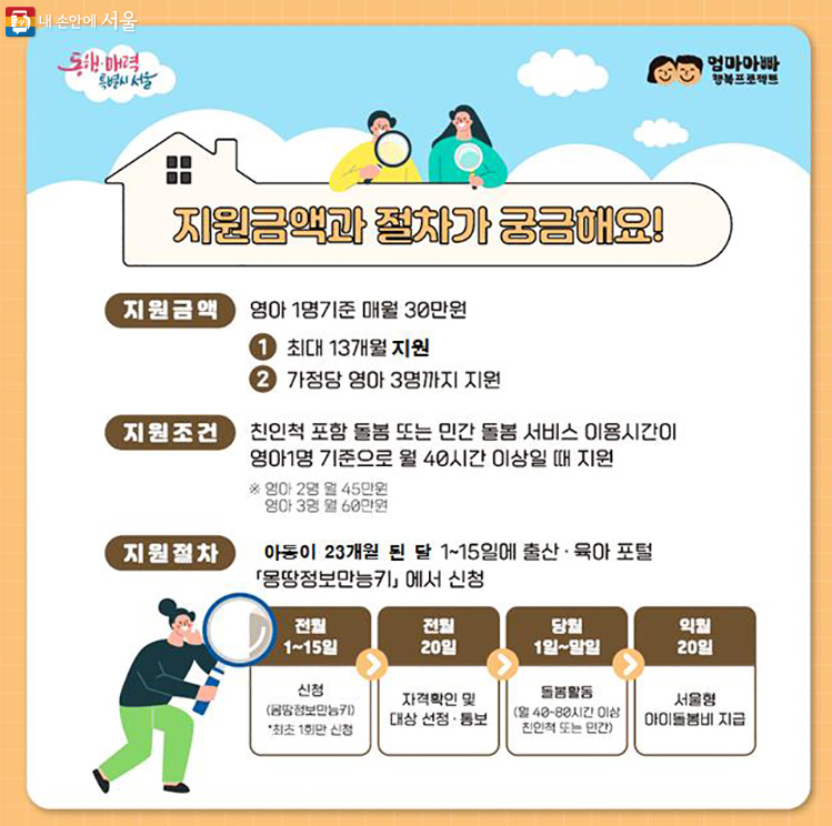 서울시는 맞벌이 등으로 양육 공백이 있는 가정을 지원하기 위해 조부모나 4촌 이내 친인척이 만 24개월부터 36개월 사이의 아이를 돌볼 경우, 돌봄수당을 지원하는 제도를 운영하고 있습니다.