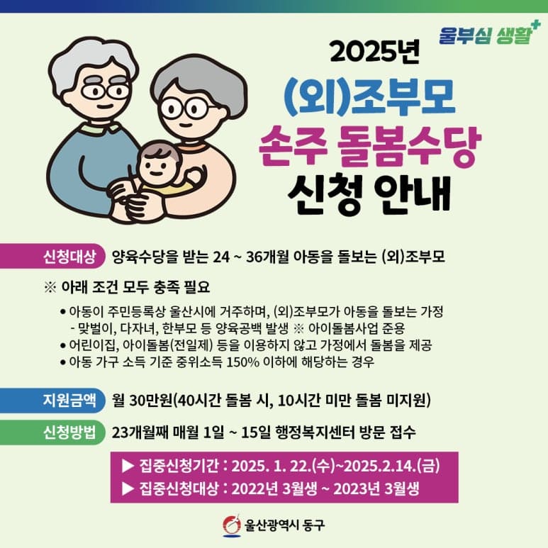 - 지급 방식: 수당은 조부모 계좌로 직접 입금되며, 조부모가 울산시민이 아닐 경우 부모 계좌로 지급