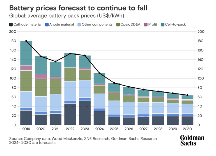골드만삭스 리서치 또한 2026년 평균 80달러/kWh 달성을 예상하며,